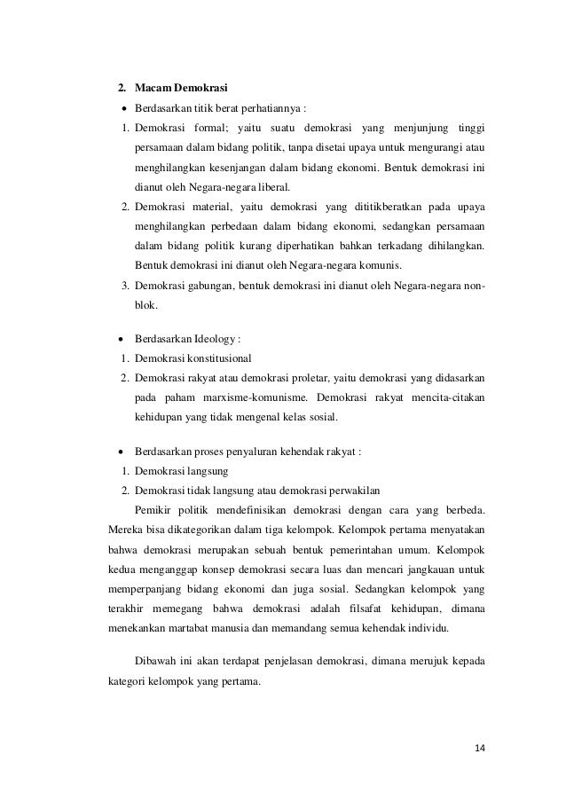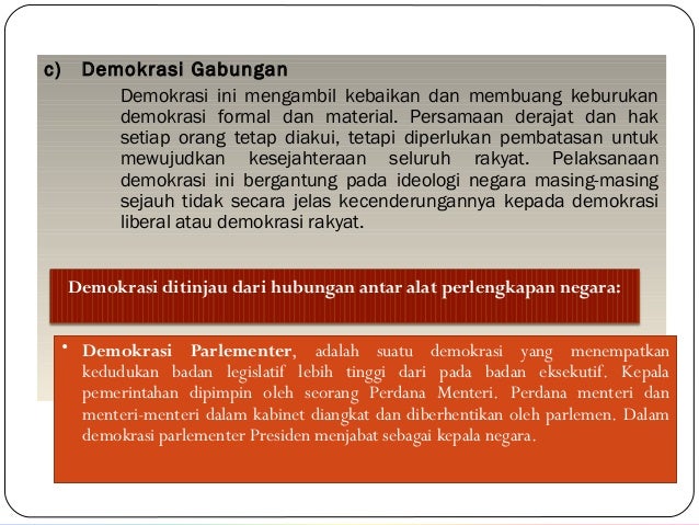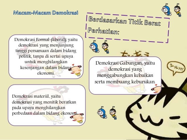 Demokrasi material yaitu demokrasi yang dititikberatkan pada upaya menghilangkan perbedaan dalam. Untuk itu jalan yang ditempuh demokrasi maju adalah penyebarluasan sumberdaya ekonomi posisi dan. Corak pemerintahan yg semata-mata dilihat dr ada atau tidaknya lembaga politik demokrasi spt perwakilan rakyat.