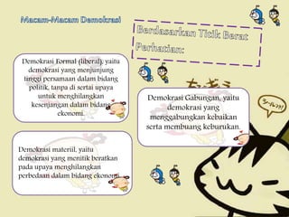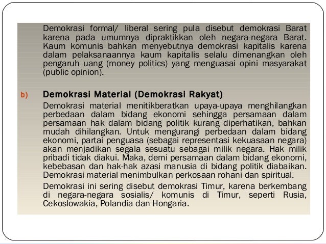 Demokrasi formal yaitu. Menurut Kamus Besar Bahasa Indonesia demokrasi dalam istilah politik yang berarti pemerintahan. Demokrasi material yaitu demokrasi yang dititikberatkan pada upaya menghilangkan perbedaan dalam bidang ekonomi sedangkan persamaan dalam bidang politik kurang. Demokrasi formal yaitu suatu demokrasi yang menjunjung tinggi persamaan dalam bidang politik tanpa disertai upaya untuk mengurangi atau menghilangkan kesenjangan dalam bidang ekonomi.